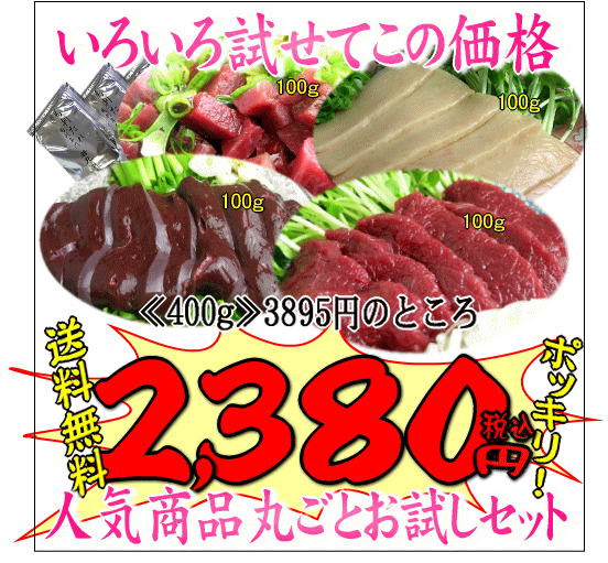 【送料無料】【2個でおまけ付】馬刺し赤身100gレバー刺し100gタテガミ刺し100g馬刺し中落ち100g丸ごとお試しセット10P22Jul11